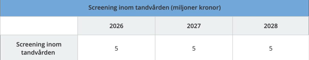 För att undersöka möjligheten att genomföra screening inom tandvården avsätter därför regeringen 5 miljoner kronor under 2026 och beräknar avsätta 5 miljoner kronor årligen under 2027–2028.