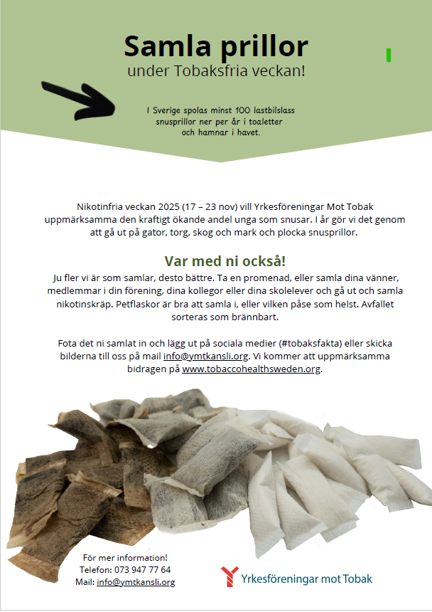 Nikotinfria veckan 2025 (17 – 23 nov) vill Yrkesföreningar Mot Tobak uppmärksamma den kraftigt ökande andel unga som snusar. I år gör vi det genom att gå ut på gator, torg, skog och mark och plocka snusprillor.Var med ni också! Ju fler vi är som samlar, desto bättre. Ta en promenad, eller samla dina vänner, medlemmar i din förening, dina kollegor eller dina skolelever och gå ut och samla nikotinskräp. Petflaskor är bra att samla i, eller vilken påse som helst. Avfallet sorteras som brännbart.Fota det ni samlat in och lägg ut på sociala medier (#tobaksfakta)eller skicka bilderna till oss på mail info@ymtkansli.org. Vi kommer att uppmärksamma bidragen på här på hemsidan. Ladda ned flyer här och sprid vidare |